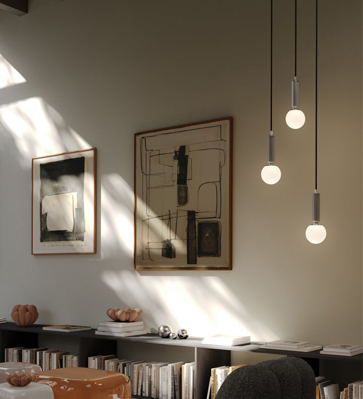 A Pearl floor lamp and Pearl pendant lamp with movable screen