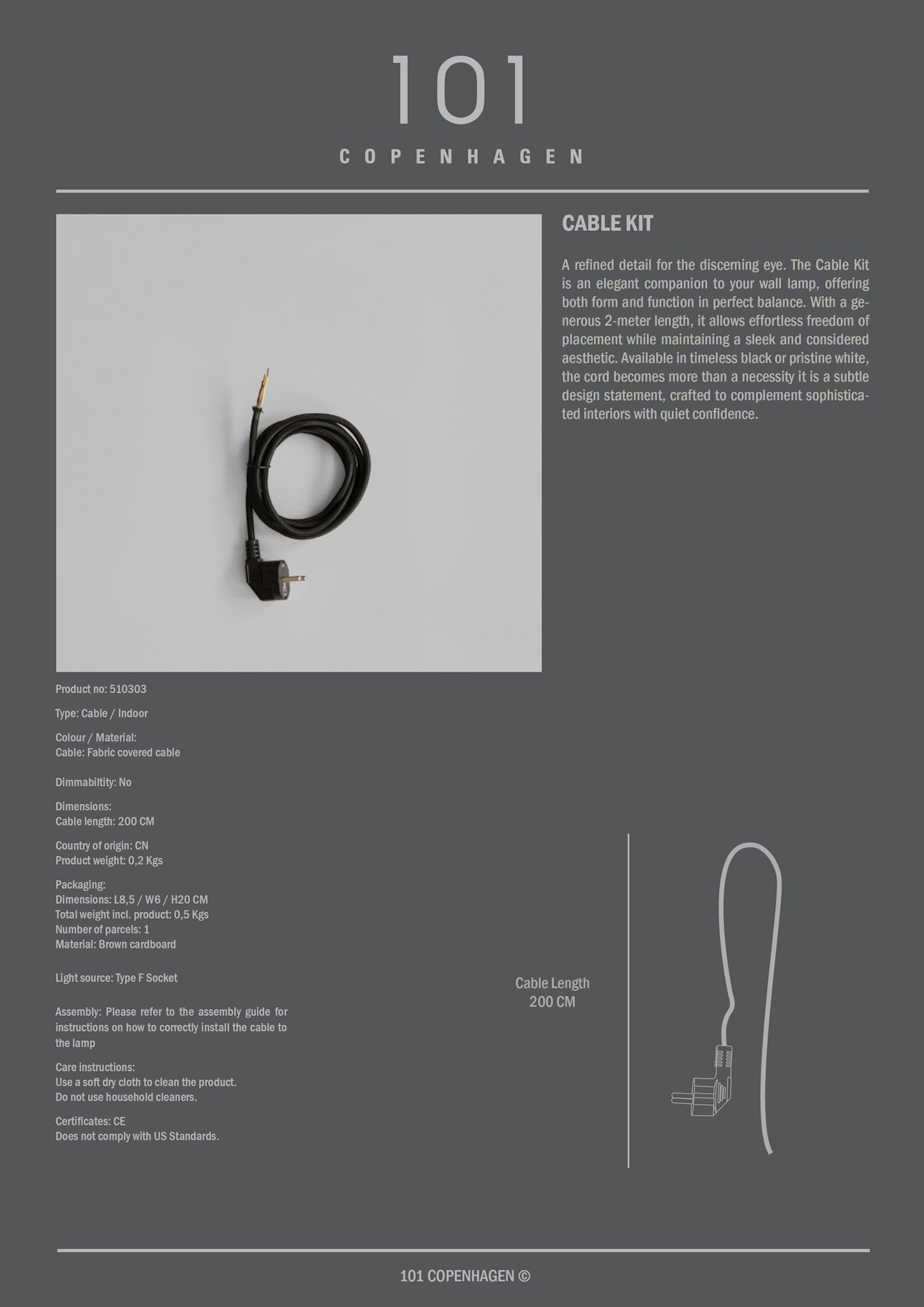 A refined detail for the discerning eye. The Cable Kit is an elegant companion to your wall lamp, offering both form and function in perfect balance. With a generous 2-meter length, it allows effortless freedom of placement while maintaining a sleek and considered aesthetic. Available in timeless black or pristine white, the cord becomes more than a necessity it is a subtle design statement, crafted to complement sophisticated interiors with quiet confidence.