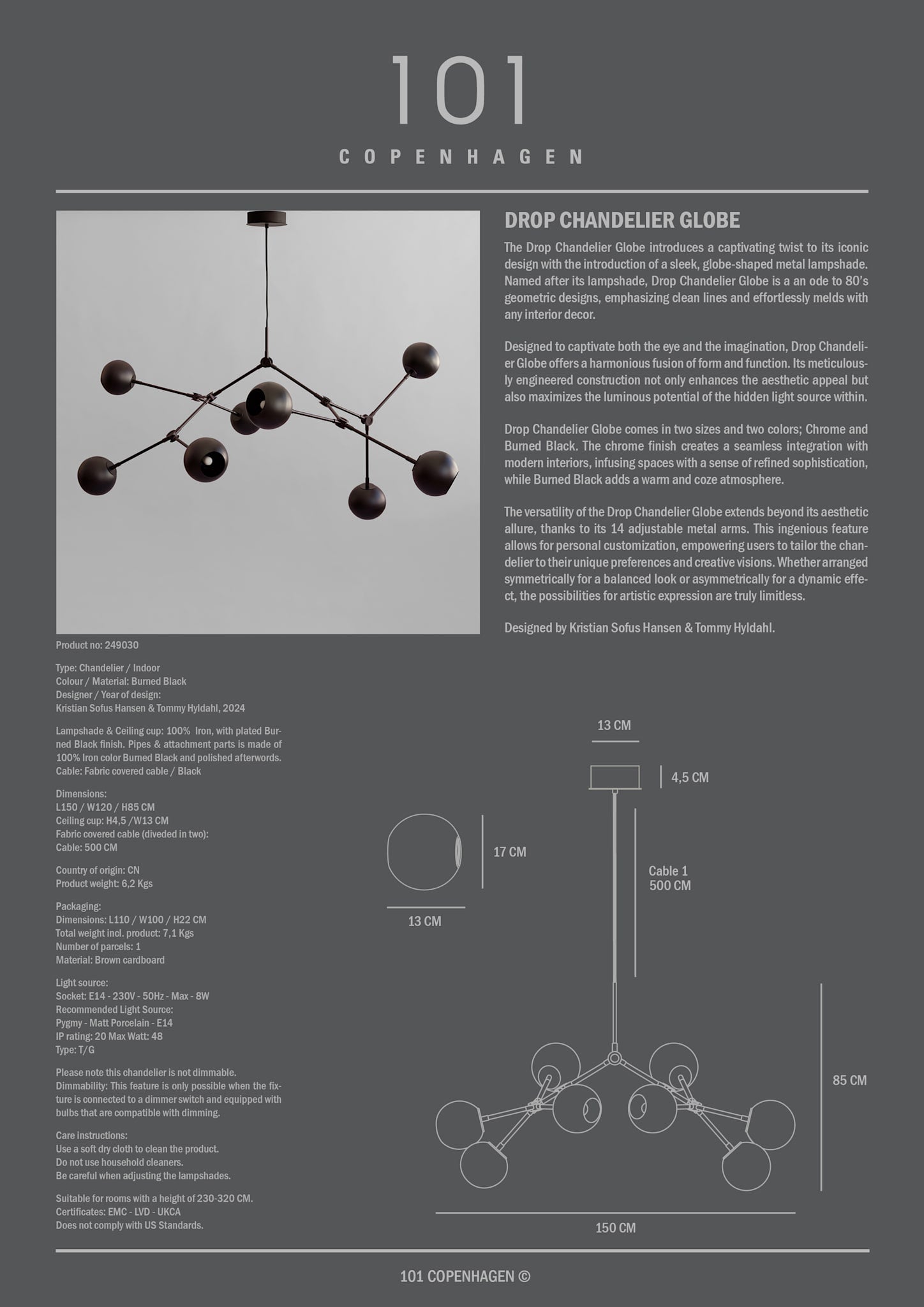 The Drop Chandelier Globe introduces a captivating twist to its iconic design with the introduction of a sleek, globe-shaped metal lampshade. Named after its lampshade, Drop Chandelier Globe is an ode to 80’s geometric designs, emphasizing clean lines and effortlessly melds with any interior decor.
