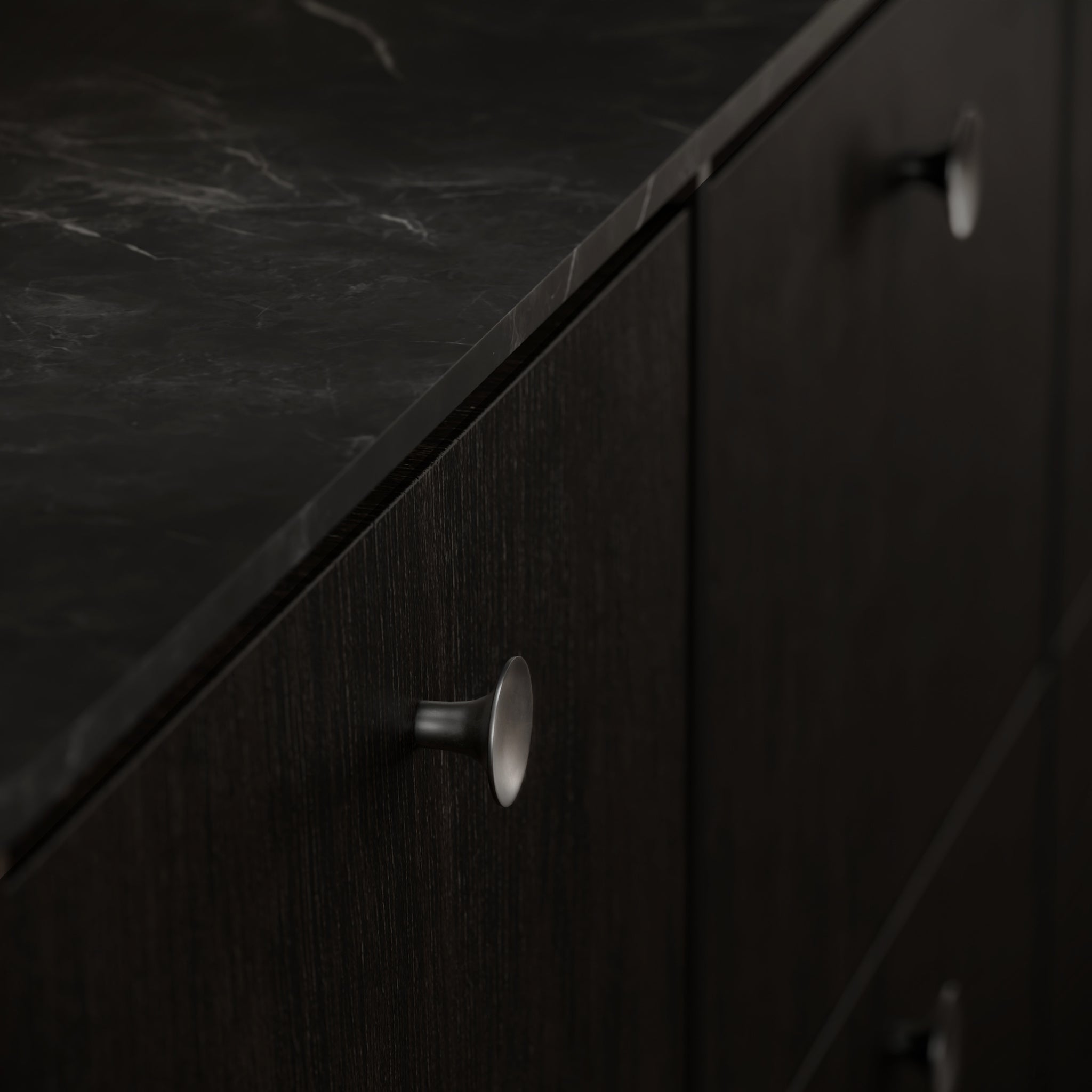 One recognizes various musical instruments when looking at the playful Hi-Hat knobs, from a classical cymbal to the bell of swinging brass instruments. The knobs are made from iron and comes in a plated brass, burned black, brushed steel or plated bronze colour, adding warmth and elegance to the wall. Each knob comes with two different screws for mounting directly in a wall or to mount on a kitchen or furniture front.