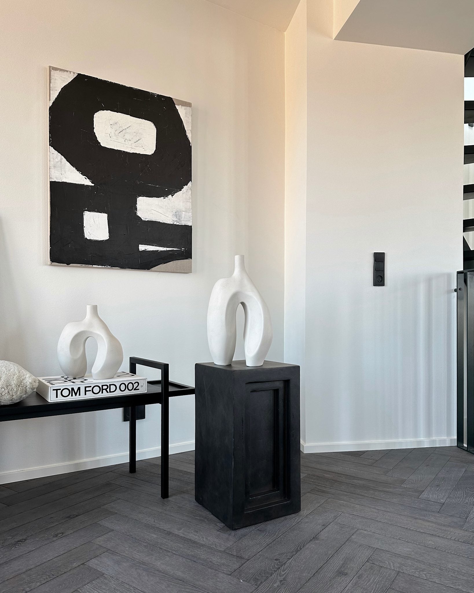 Characterized by two sculptural legs that meet at a central point, the design creates a subtle sense of balance and tension. A small opening at the top offers space for a single branch, a few delicate stems, or a minimalist arrangement - though the vase is equally striking as a standalone art piece.