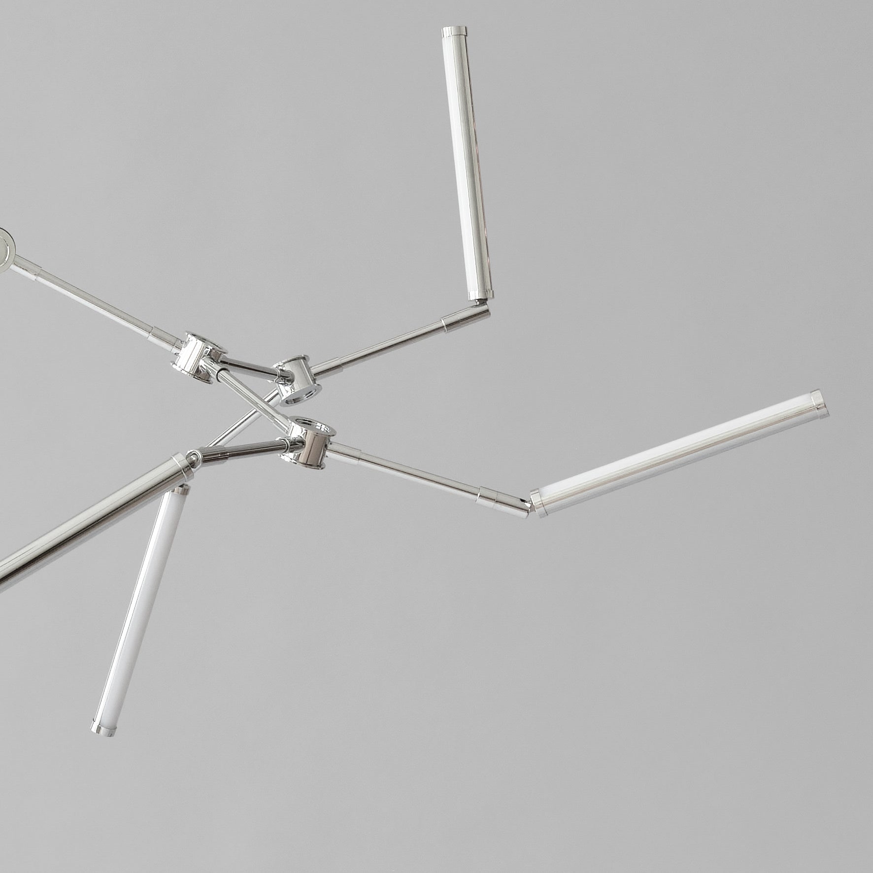 Shifting away from the starkness typically associated with neon, these innovative lamps exude a warmer, more inviting glow, setting the ambiance for a cozy and comforting atmosphere. The chandelier features eight adjustable arms, allowing each light element to be repositioned and angled as desired. This flexibility gives users the freedom to create dynamic, personalized compositions - whether uniform and symmetrical or expressive and asymmetrical.