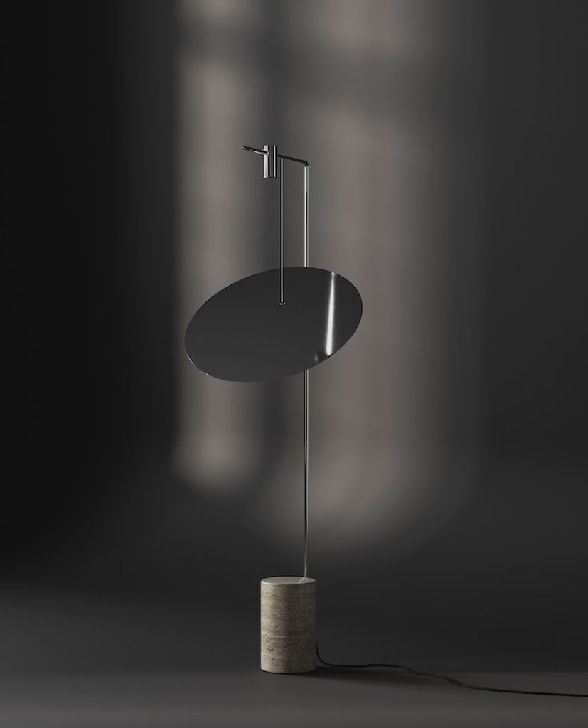 Inspired by the ethereal beauty of the cosmos, this minimalist design embodies the quiet elegance of celestial bodies suspended in space. Two radiant light sources glow like distant stars, gracefully positioned along a polished chrome arm. Floating effortlessly, an oversized chrome lampshade mirrors the moon itself, casting a luminous reflection from both sides and creating an atmosphere of depth, clarity, and quiet wonder. Grounded by a solid Silver Travertine base, the Moon Lamp achieves the impossible – a balance between weight and weightlessness, structure and fluidity, function, and artistry.